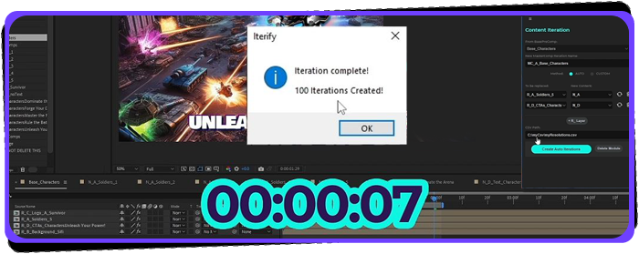 Iterify includes extra tools to help with your daily tasks: create multiple comps from text, generate comps from folders, pre-compose with auto-cropping, rename comps, and shrink text.